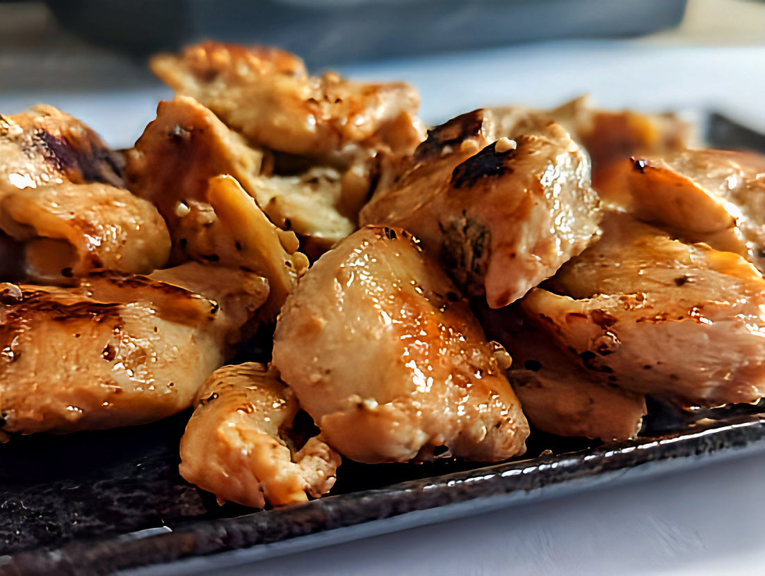 青森シャモロックのお肉をブラックペッパーとにんにく風味のタレに漬けこみ真空パック。フライパン等で加熱してお召し上がりください。